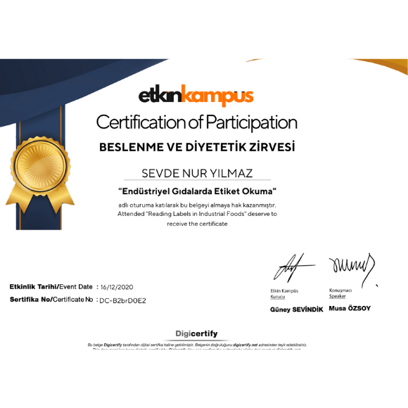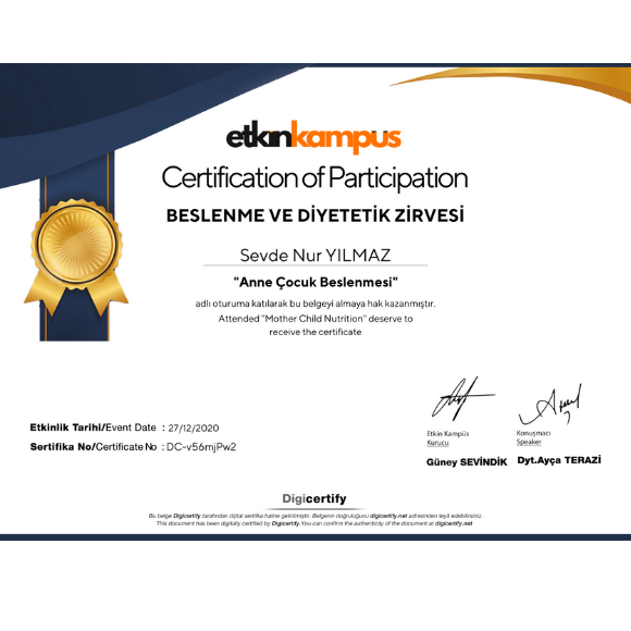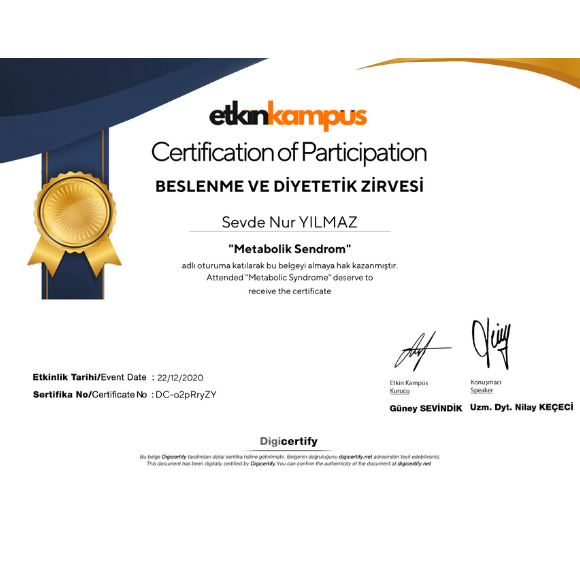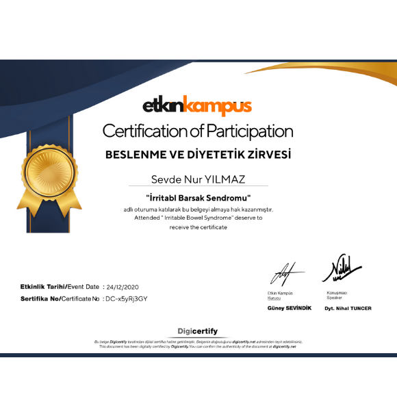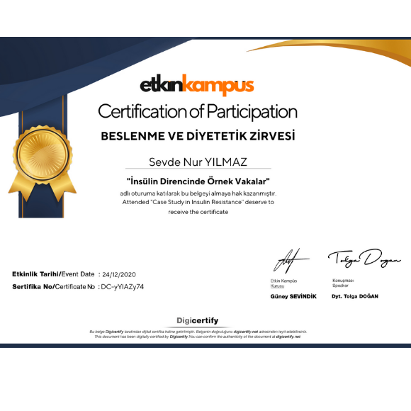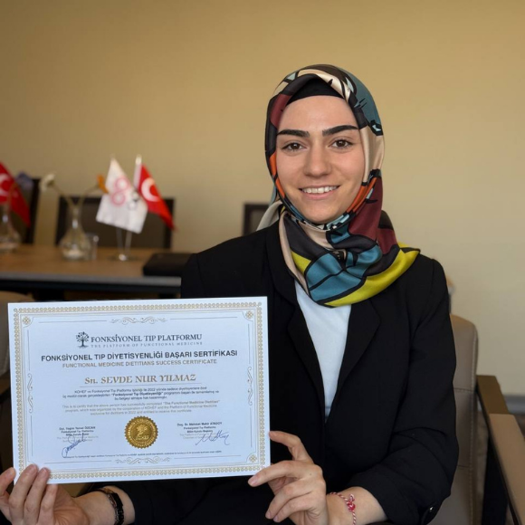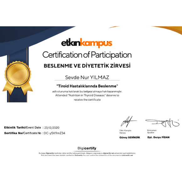 2022 yılında Fonksiyonel Tıp Platformu tarafından düzenlenen Fonksiyonel Tıp Diyetisyenliği Sertifikasyon Programı’na katıldım. Yoğun ve kapsamlı bir eğitimin ardından yapılan sınavdan başarıyla geçerek sertifikamı almaya hak kazandım.